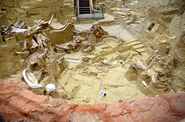 You are now standing on the edge of the sinkhole noticeable by the rim of the red Spearfish shale. 140,000 years ago, the sinkhole was filled with warm water. The majority of plant remains recovered from the sinkhole indicate a tree and grassland environment: a variety of grasses, hackberry (Celtis), and sedges (Carex), with small areas of scattered oak (Quercus), willow (Salix) and pine (Pinus). The sinkhole pond likely offered an attractive water and food source for the local fauna. Unfortunately, the edge of the sinkhole being lined with red Spearfish shale made the sides of the pond very slippery. When the mammoths were enticed into the pond they soon found that the combination of the slippery shale and the steep angle of the pond edge fatally entrapped them.