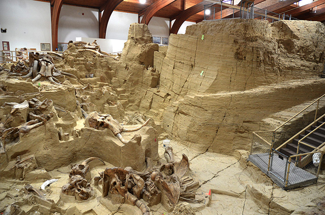 And this is it – you have traveled all around the sinkhole pond, the Bonebed, and are now back to the spring conduit – the source of the water filling the pond. Did you know that The Mammoth Site has a well-equipped MicroFauna Lab where researchers can study the skeletons of small mammals in addition to the tiny bones of lizards, frogs, salamanders, and snakes found during the screen washing of the pond sediment? The lab also has a large comparative collection of snails and clams. All these remains help scientists reconstruct the local environment of the Ice Age. The Self-Guided Tour that you just finished provided you with a snapshot the essence about the natural history recorded in this sinkhole pond. You are more than welcome to walk around the Bonebed again, at any speed you want. Take pictures. Revisit select stops and view the wall displays for more information.