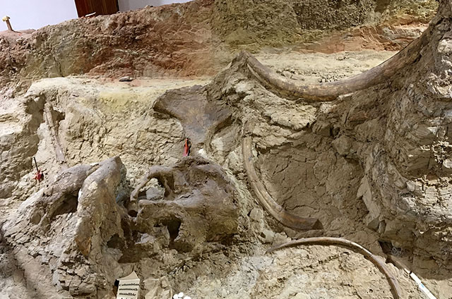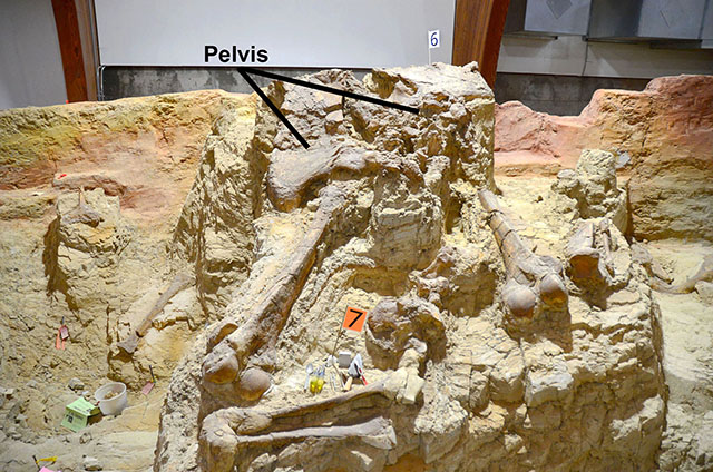 Take a look down to your left from Flag 7 and you will see another Columbian mammoth skull, maybe its lower jaw right next to it (upside down), another half pelvis nearby towards the wall, and a huge, long tusk above. Unless the jaw is articulated with the skull, there is only an assumption that the jaw is part of this skull. Interestingly, at this depth within the pond, researchers find many mammoth skeletal remains littering the edge of the sinkhole.
