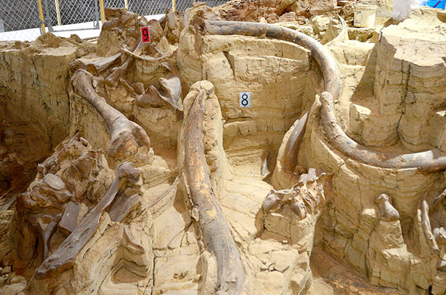 You are now at the far western edge of the sinkhole but still on the inside. Take a look at the number of isolated tusks in the area immediately below where you are standing. Realize that tusks are ever-growing teeth and are only loosely connected into the socket of a skull. Because of this, they can easily slide out of the socket while the carcass is decomposing. There are no tusks in the lower jaw of elephants and mammoths but some distant relatives have tusks in both upper and lower jaws. Thus far there are 122 tusks recovered in the sinkhole and knowing that each individual had only two tusks when it died, a minimum of 61 mammoths are currently exposed. Only two mammoths have been identified as the smaller woolly mammoth.