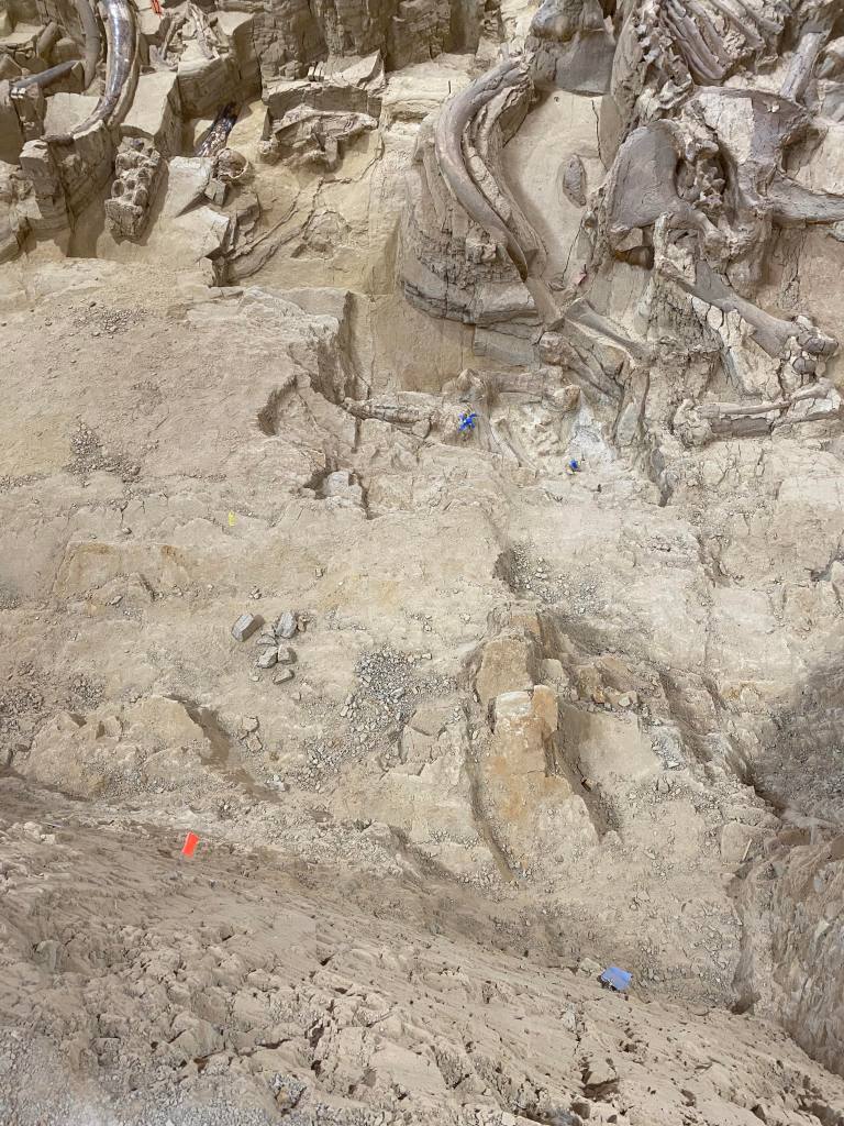 Now look down into the excavation pit where all the skeletons are located. Flag 11 is a Columbian mammoth skeleton that we have named ‘Murray.’ Look closely…it is an almost entire articulated skeleton (meaning all in life position) but