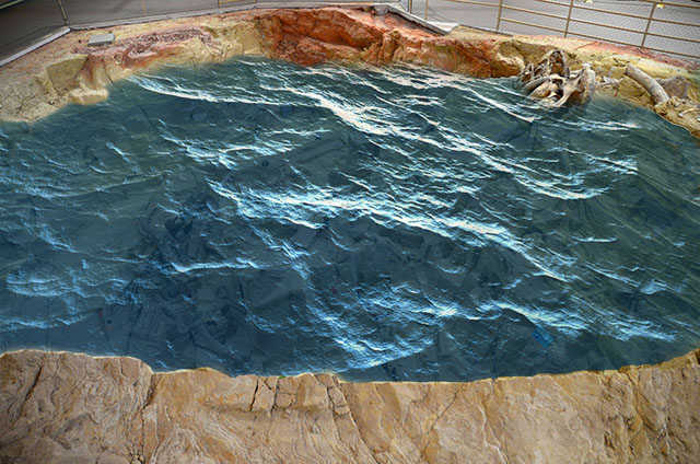 If you were here in the Ice Age when those bones were just settling to the bottom of the pond, you would be in the middle of a warm-water pond, treading water, looking for a way out of this pool where the only potential way out might be behind you, where the edges of the pond might be less abrupt. At one time, the water was 50-60 ft. deep – you could not come close to touching the bottom. But over the millennia, the sinkhole filled in with sediments and skeletons.
