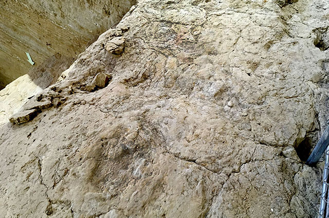 Ultimately the sinkhole lost its open-water pond scenario and developed into just a grubby meadow or a wallowing hole take a look at the swirled pattern of the sediments on either side of the pathway here at the top of the hill. As you leave the overlook, back to your right you will see still more swirls and depressions thought to represent shallow footprints. By this time in the evolution of the sinkhole, mammoths were likely to freely move into and out of the sinkhole at best there was a shallow pond. This is also a good location to view the woolly and Columbian mammoth skulls you observed at Flags 4 and 5.